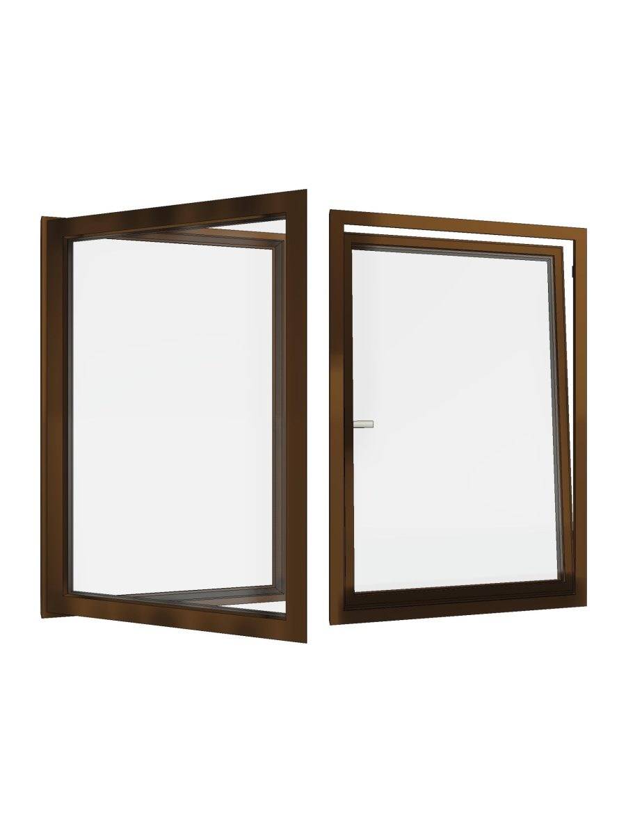 A dual action aluminum window can open inward from side hinges or tilt inward at the top like a hopper window. Rain protection and draft-free ventilation are both provided by the tilt position. Tilt & Turn windows operate as casement windows in the turn position, swinging their entire glass surface open.