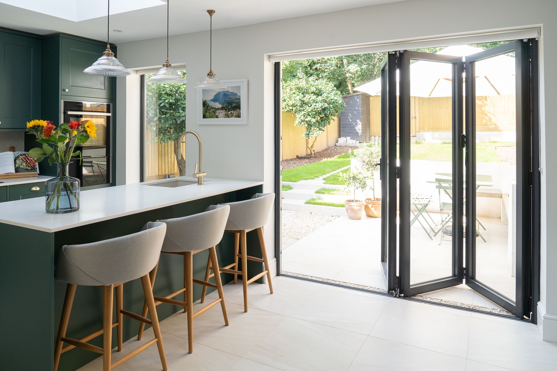 A folding door (Bi-Fold) allows you to open the entire wall by stacking the panels to the side, providing a 100% clear opening. Sliding systems always leave at least one closed glass panel. Folding doors are ideal for total indoor-outdoor integration.