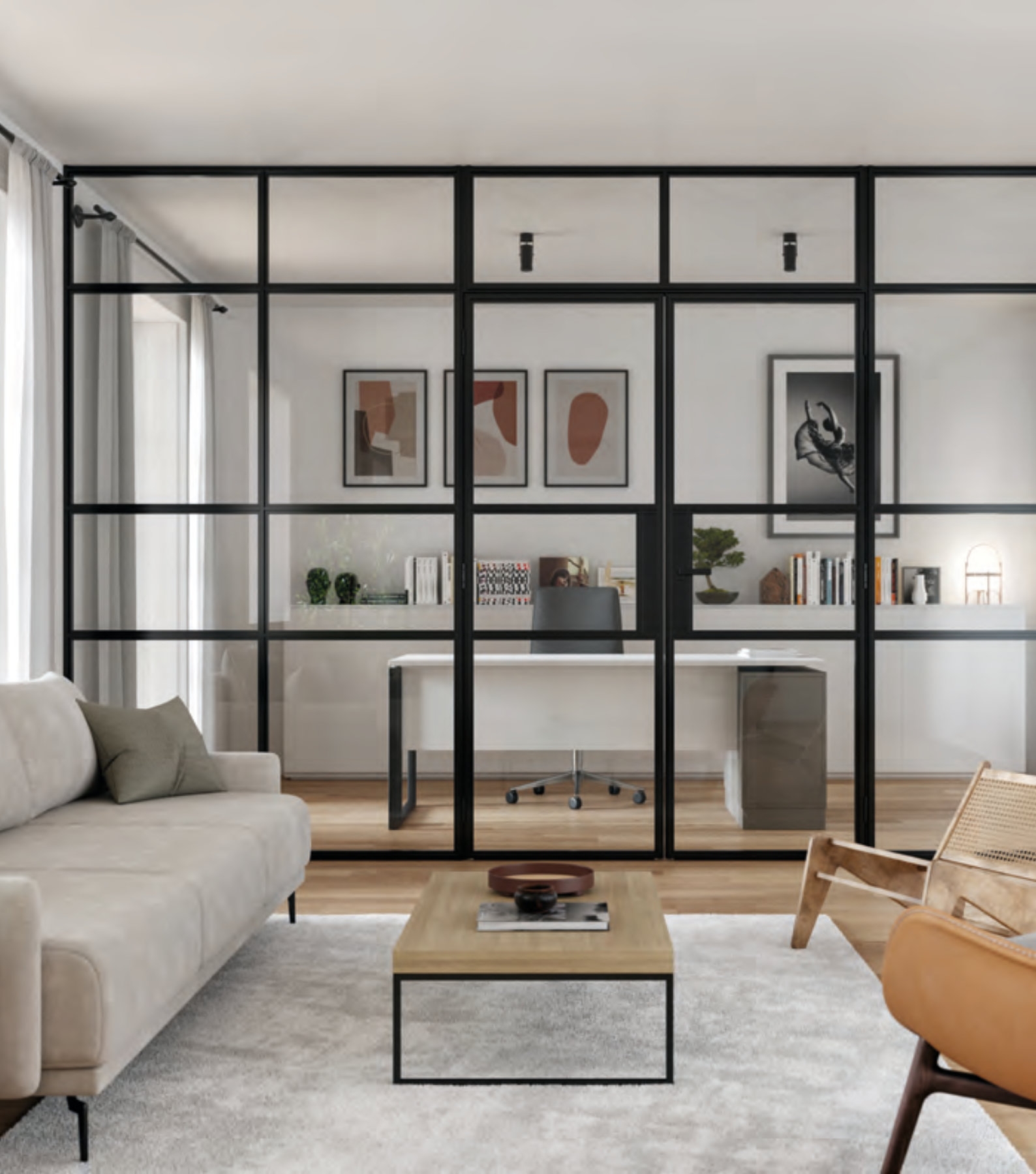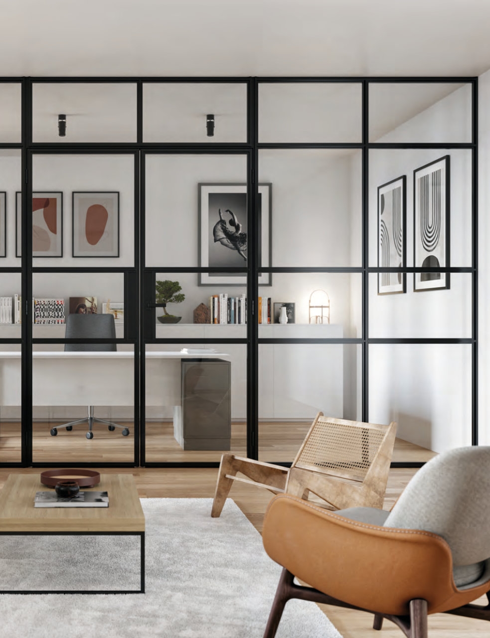 The system’s flexibility provides an almost unlimited range of design options. In addition to various alternatives featuring glass panels, including monolithic glass and laminated glass in various thicknesses, these frames can be filled with solid panels made of wood or other materials. These options let you create open, well-lit spaces, as well as design solutions for interior doors and partitions that will maintain privacy in specific areas.