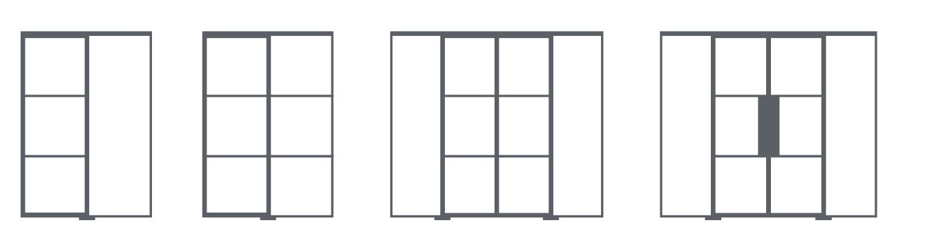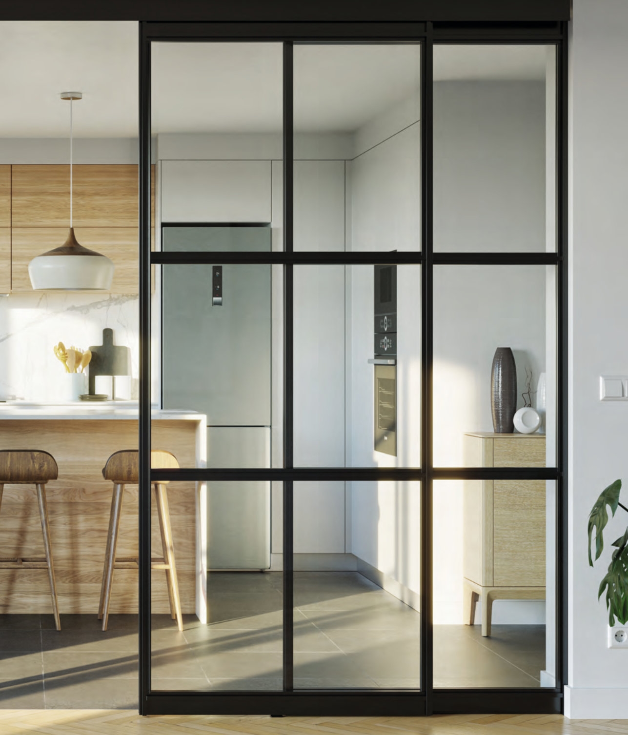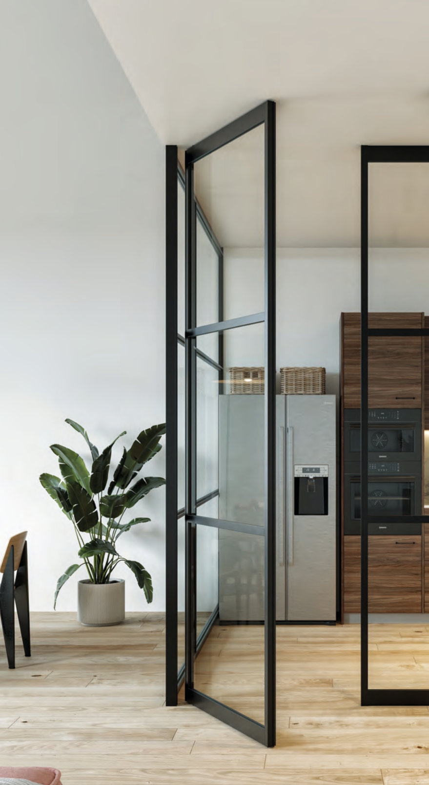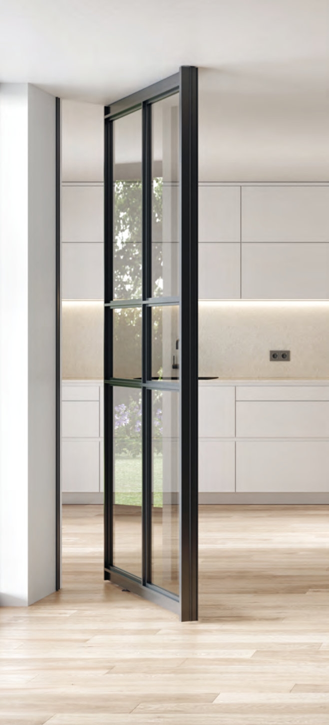 The ECO Interior system offers three versatile door types: swing doors (single or double sash), sliding doors (single or double sash), and pivot doors. All can be combined with fixed side and upper panels to create fully customized solutions for any space, from home offices to restaurant dividers.