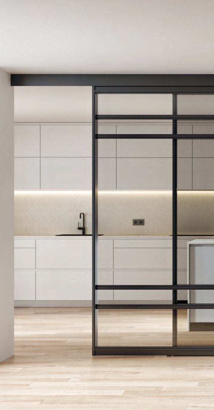 Ultra-slim aluminum profiles maximize the glass-to-frame ratio, allowing natural light to flow freely between rooms. Create brighter, more welcoming environments